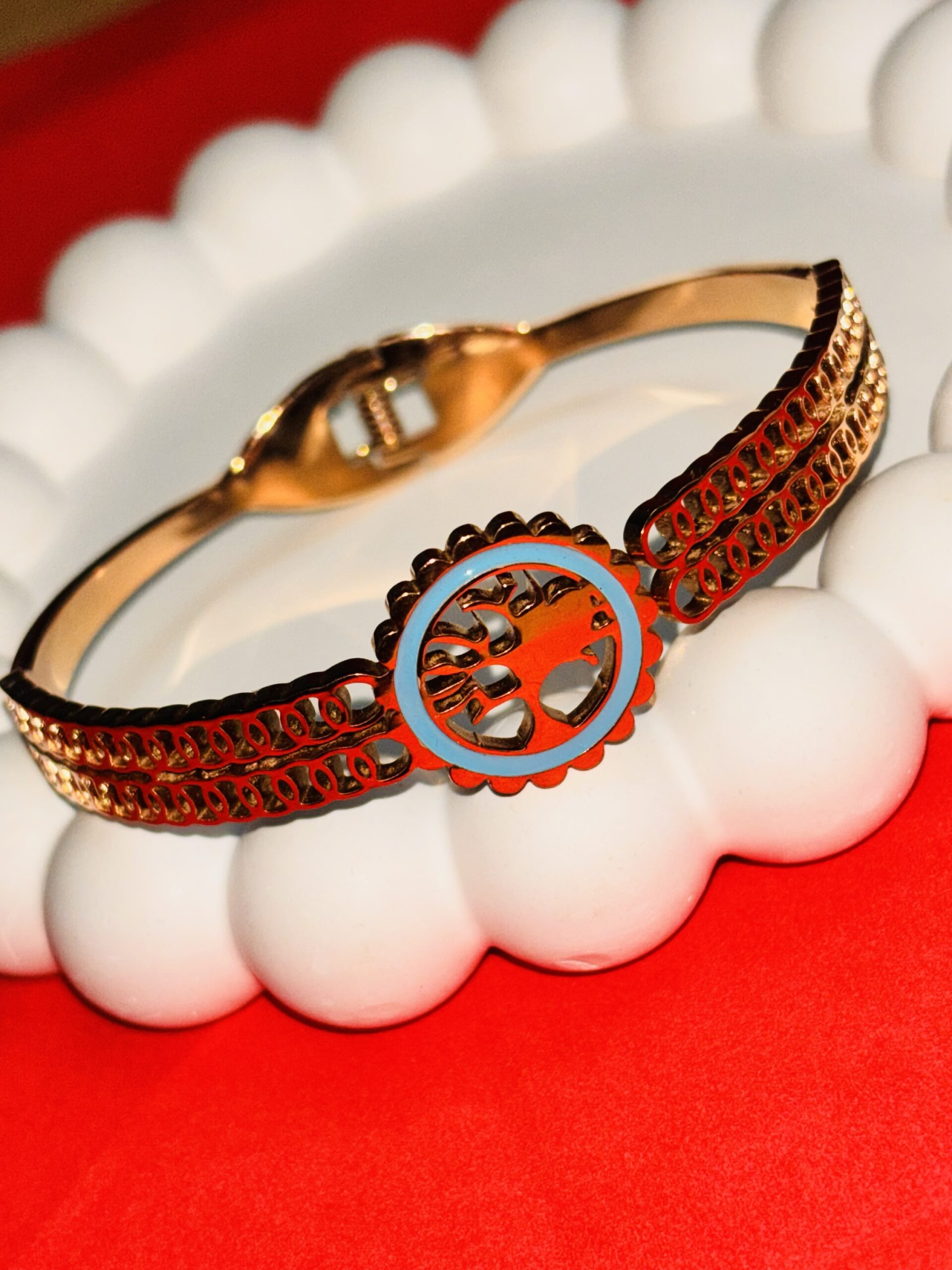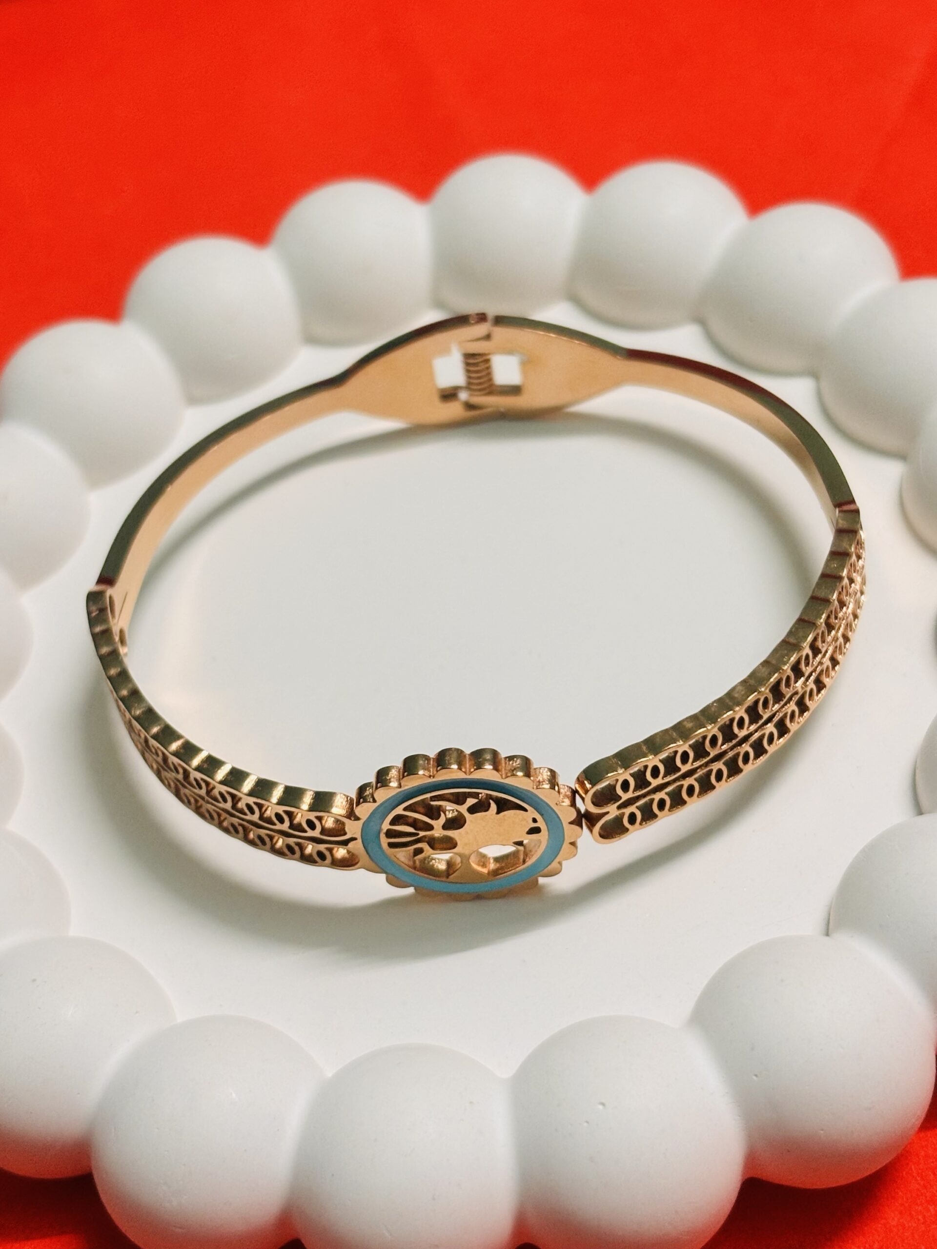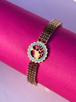Elevate your jewelry collection with a piece that balances ancient symbolism and contemporary flair. This striking gold-toned cuff features a meticulously laser-cut Tree of Life medallion at its center, encased in a vibrant turquoise-blue enamel halo. The scalloped edges of the centerpiece add a vintage charm, while the intricate, double-row geometric band provides a light, breathable feel on the wrist.
