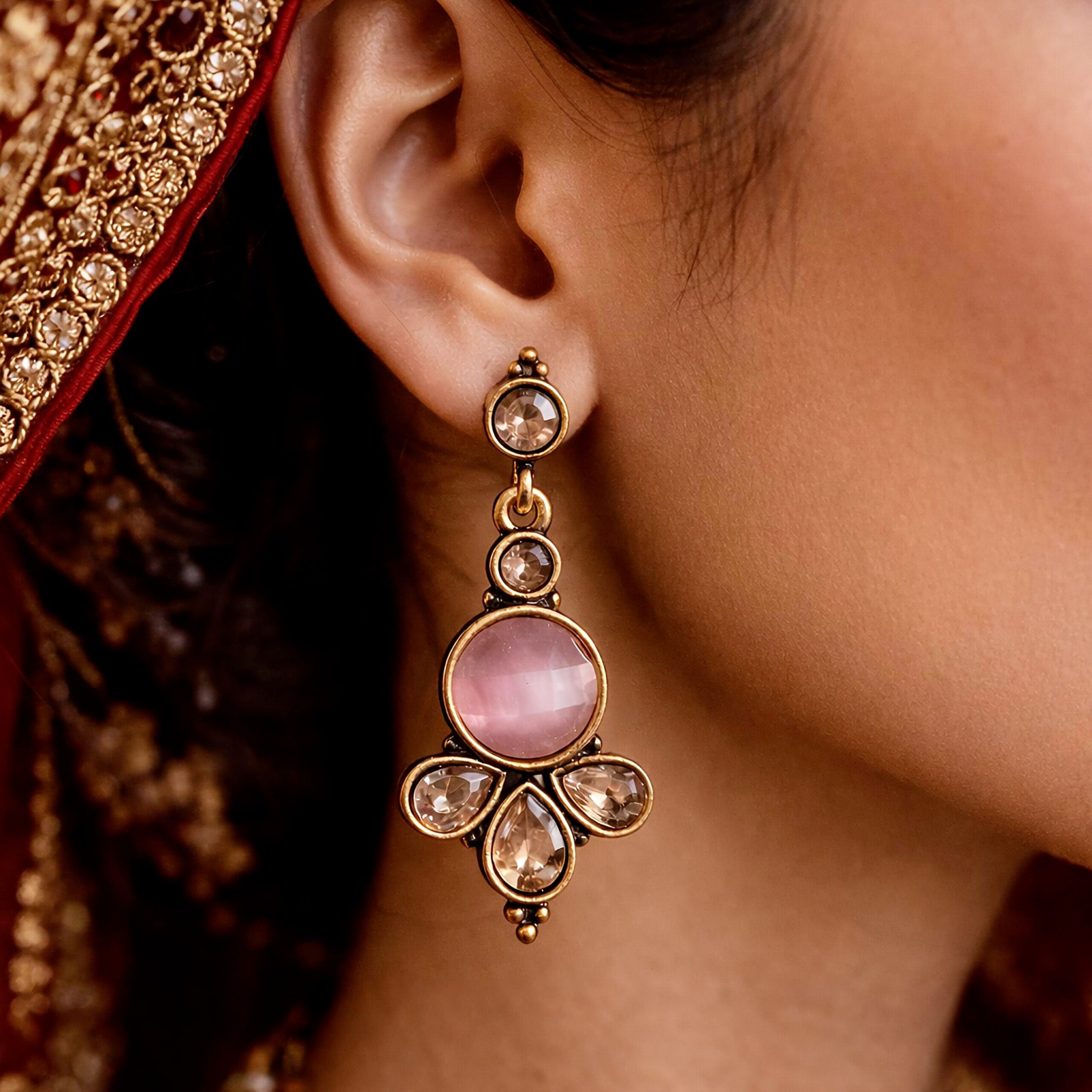 Elegant gold-toned earrings featuring soft pink stones paired with delicate crystal accents. Simple, graceful, and perfect for adding a subtle touch of sophistication to any look.