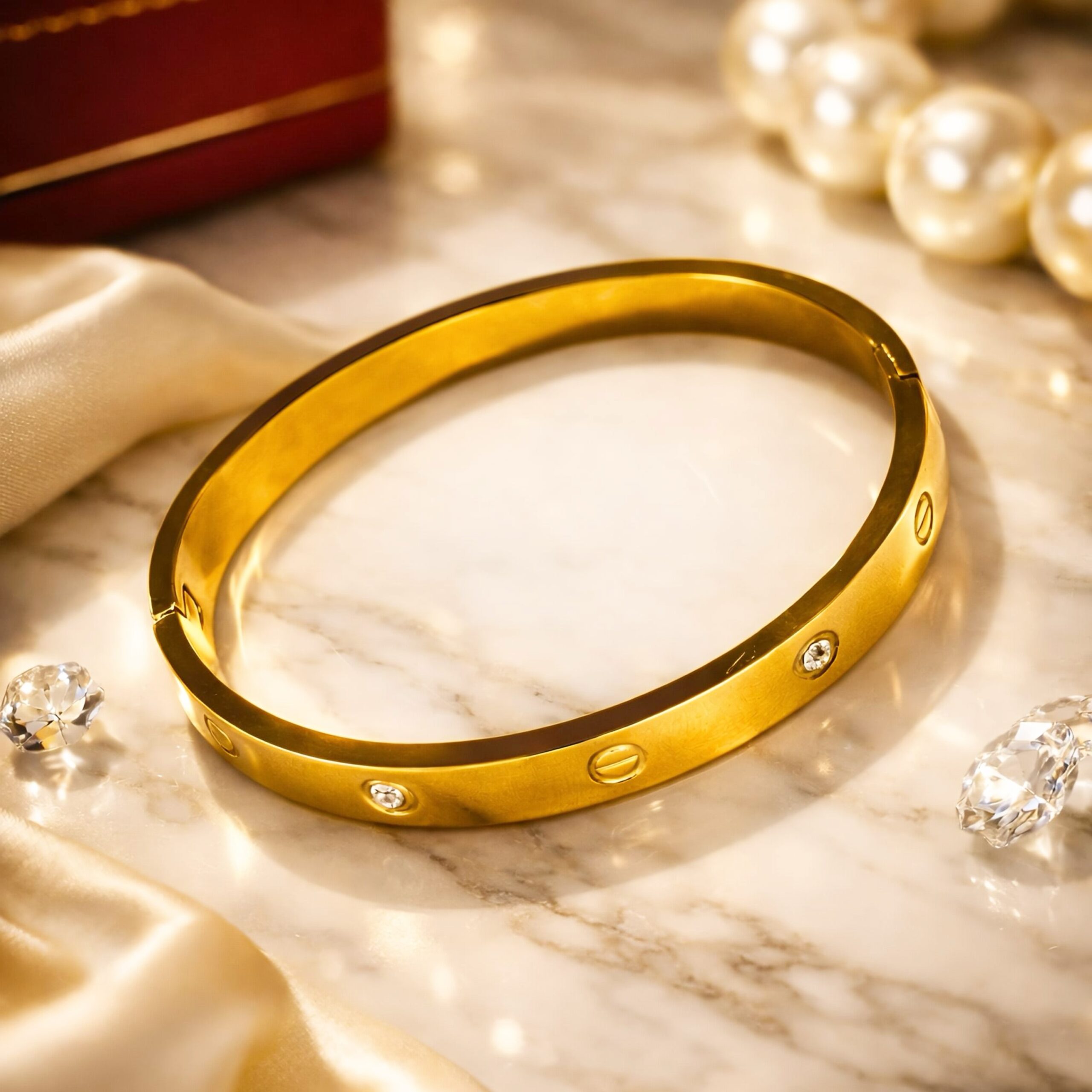 Design: A polished, wide-band bangle featuring alternating etched screw motifs and bezel-set brilliant crystals.