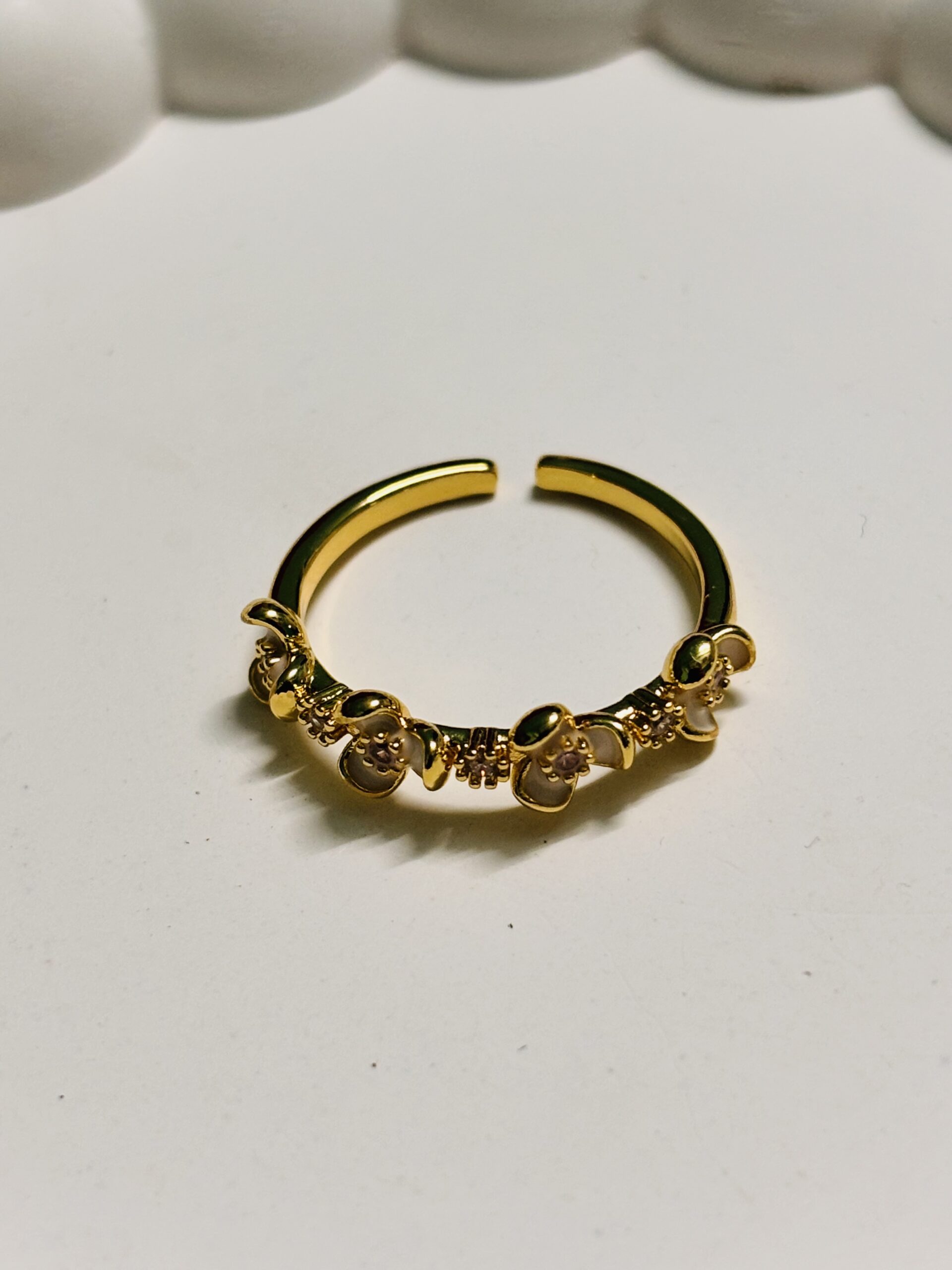 Designed with an adjustable open-ended structure, this ring offers a comfortable and customizable fit. Its warm gold finish paired with gentle pastel accents makes it a perfect accessory for both everyday elegance and special occasions.