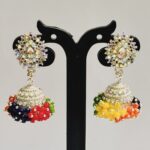 The dome-shaped jhumka is encrusted with shimmering stones and finished with rich clusters of glossy beads in joyful hues of red, navy, green, yellow, and orange ,creating a playful rainbow effect that brings life to any outfit. Each bead is delicately framed with tiny silver accents for a refined finish.