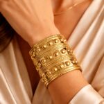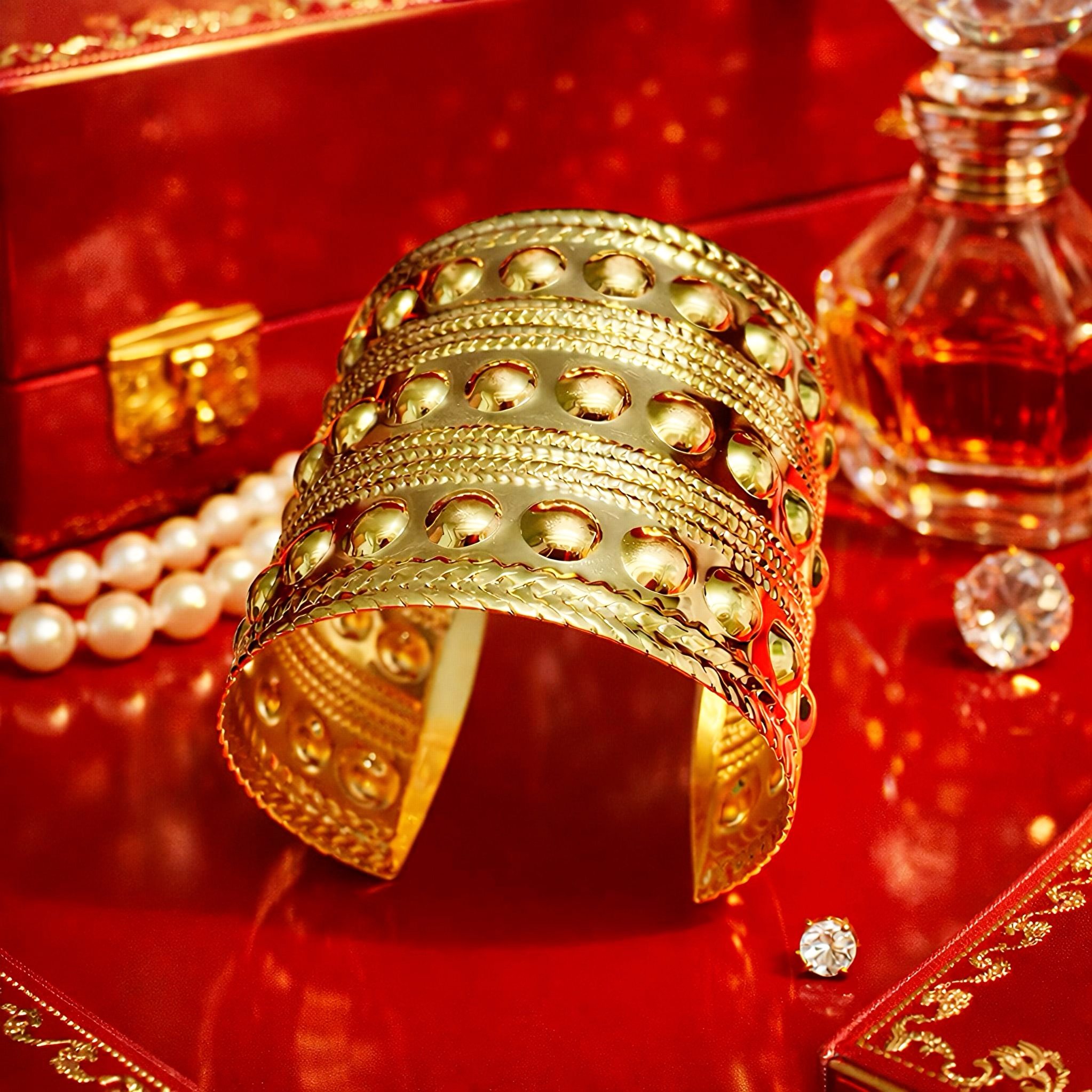 Elegant gold-tone anti-tarnish cuff bracelet featuring a bold dome design with textured detailing. A stylish statement piece that adds a luxurious and timeless touch to any outfit while staying durable and long-lasting.