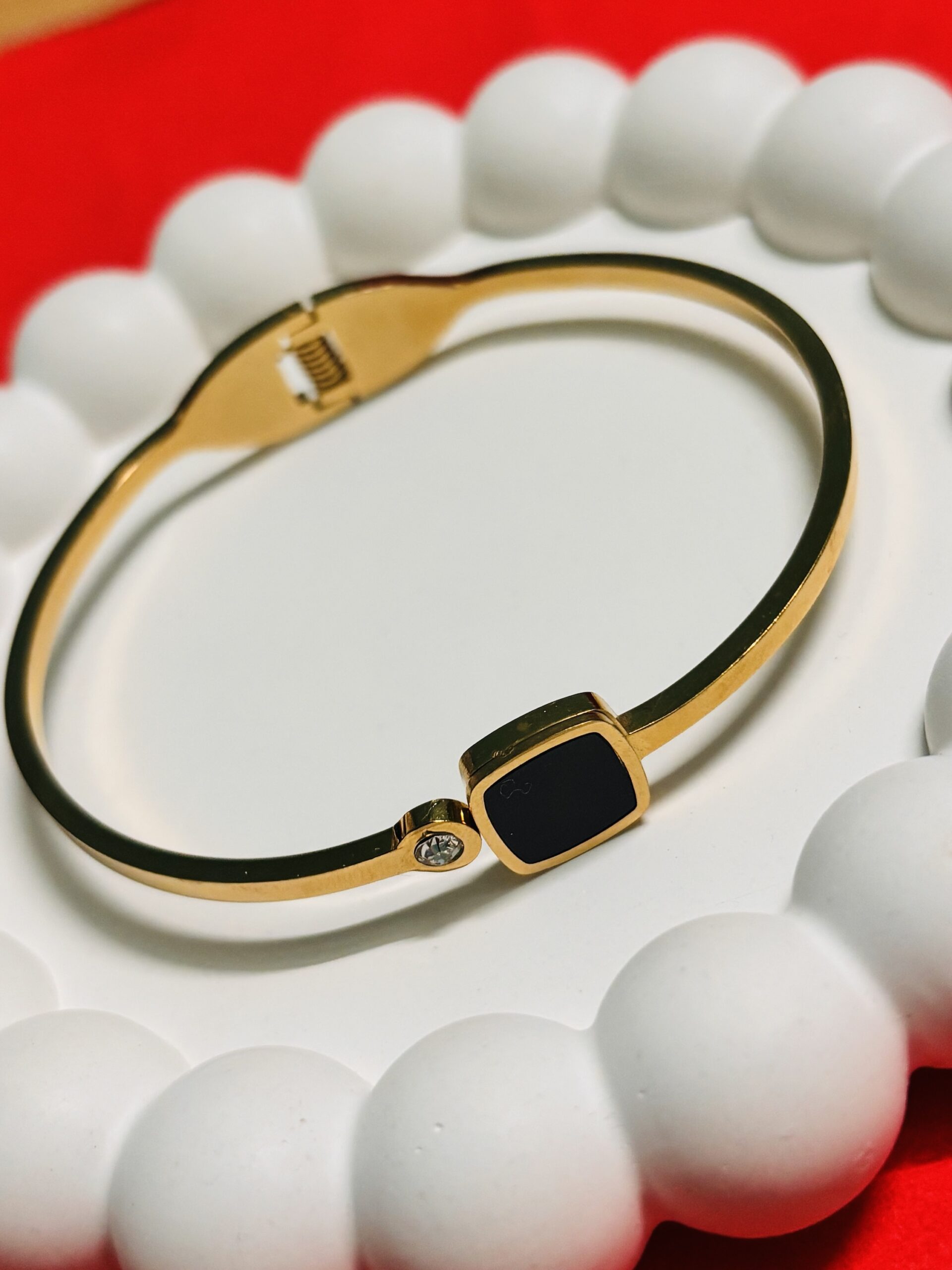 Sophistication meets durability. This minimalist bangle is crafted with a high-quality anti-tarnish finish, ensuring its radiant gold glow stays pristine through daily wear. The design features a sleek, raven-black cushion-cut centerpiece paired with a singular, brilliant-cut crystal for a touch of light. Its slim, structured profile makes it an effortless staple for the modern wardrobe, offering a luxury look that is built to last without fading or dulling.