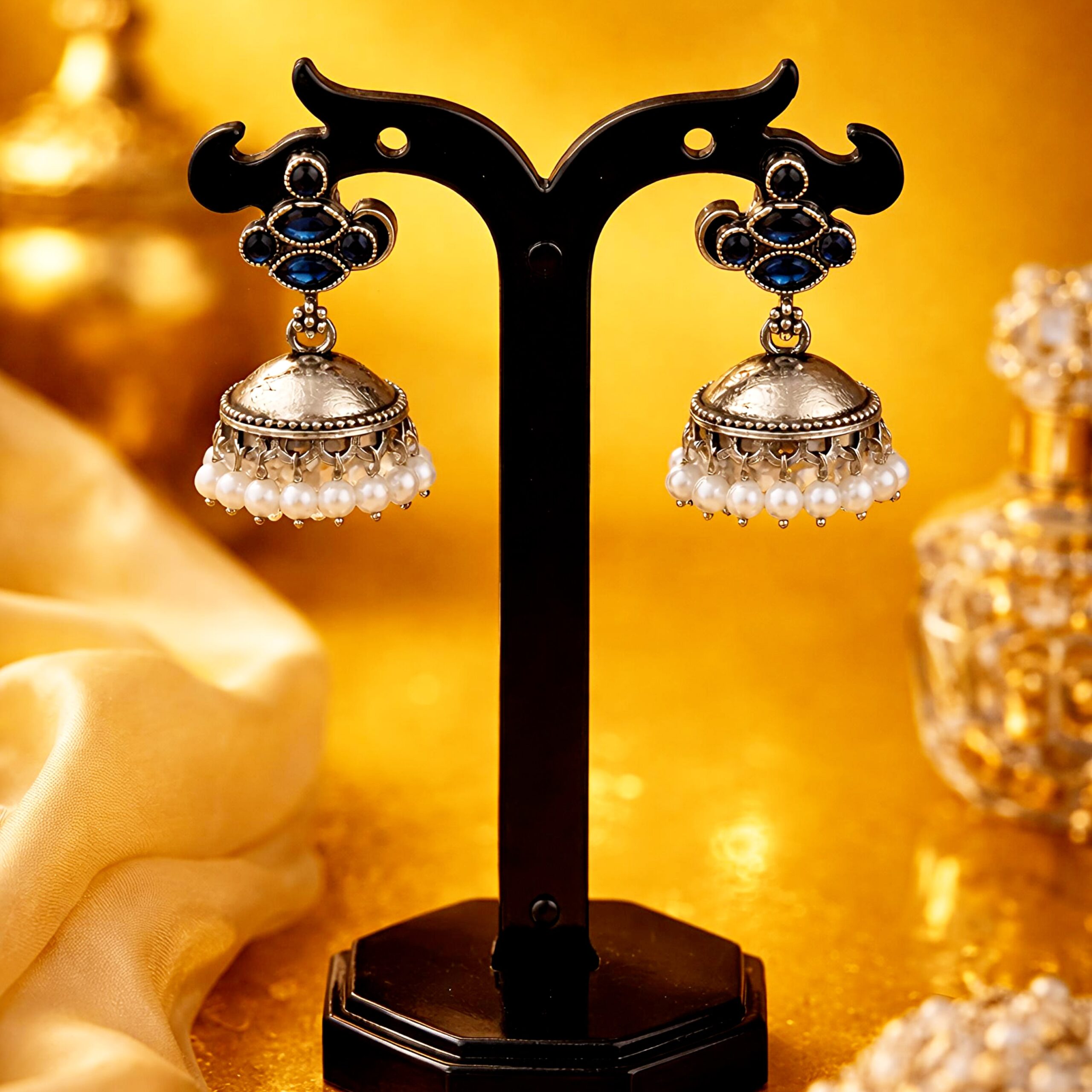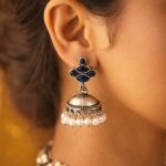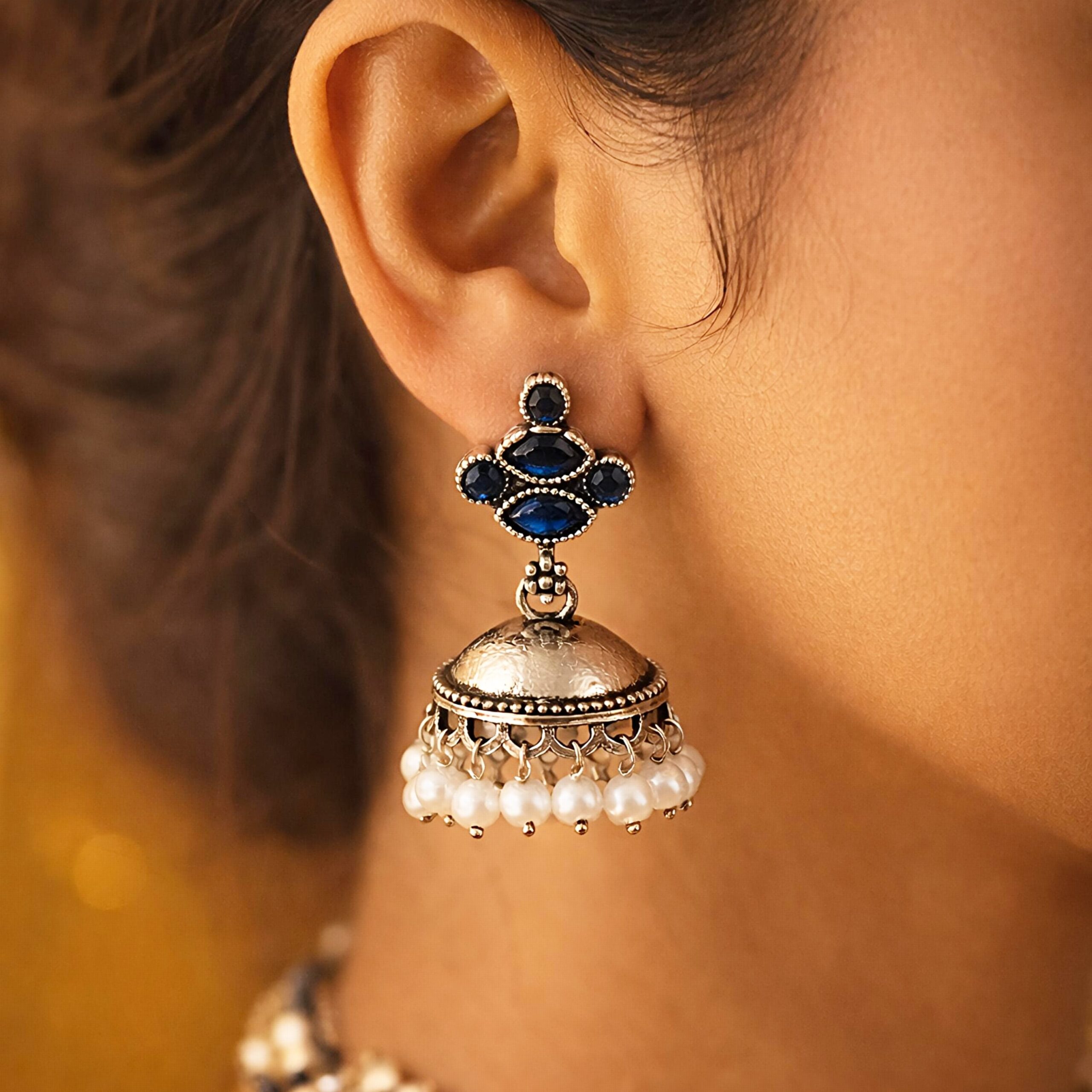 Elegant oxidised silver jhumka earrings featuring deep blue stone accents and delicate pearl drops. A perfect blend of vintage charm and subtle shine, ideal for both festive and everyday wear.