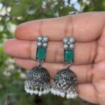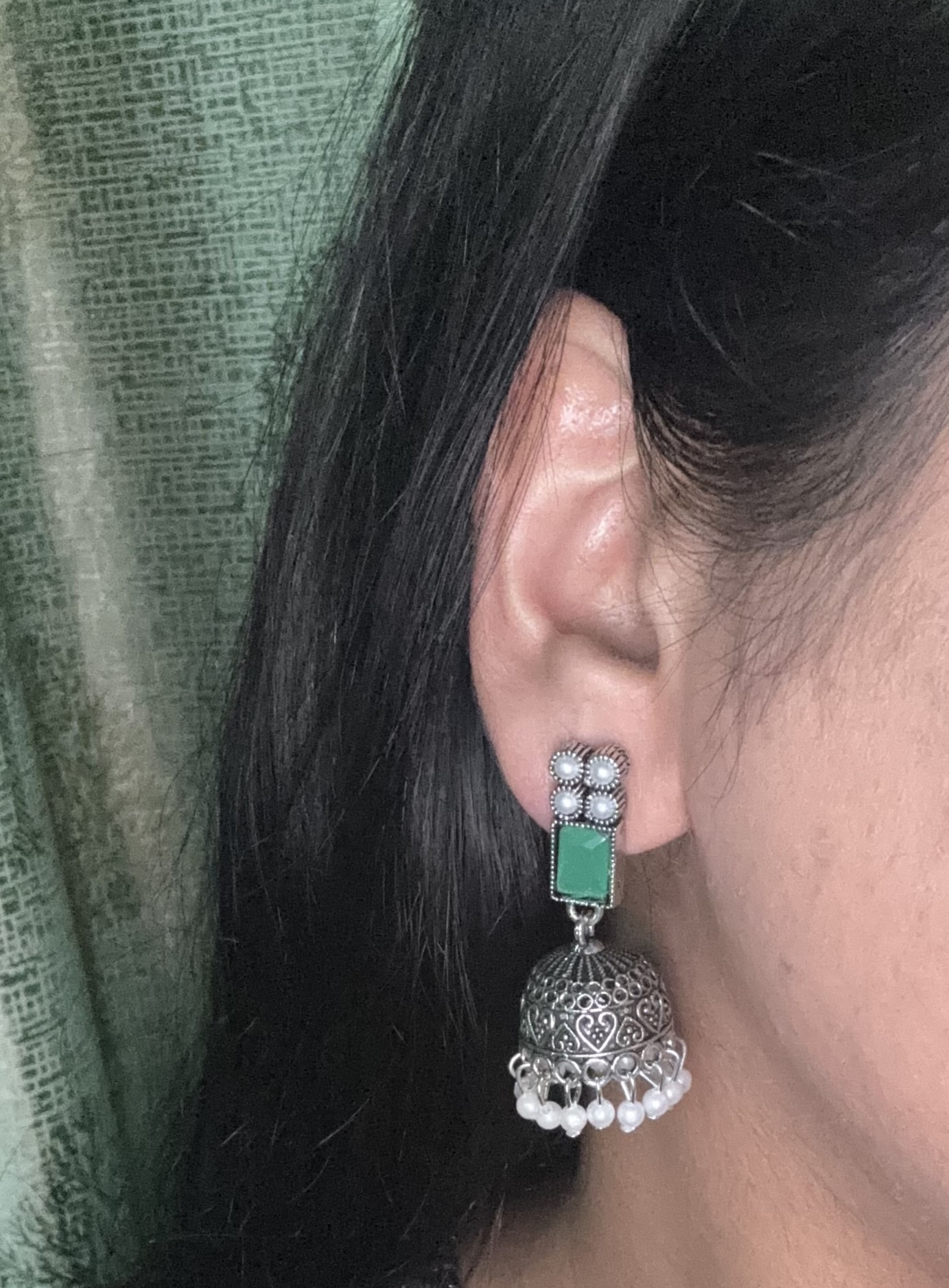 Home Earring Ethnic Earrings Oxidise Silver Green Stone Jhumka