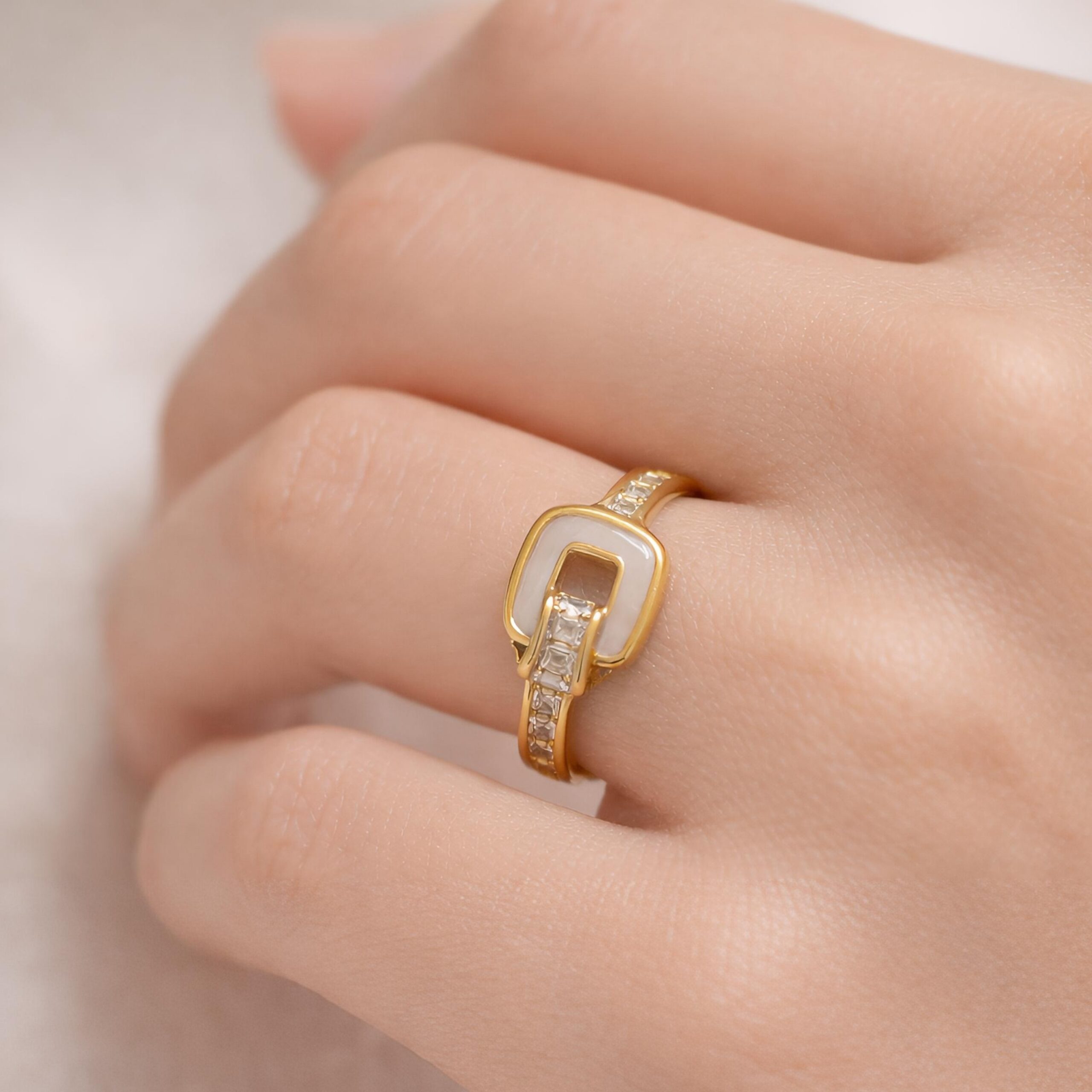 π€ Design: Elegant buckle-inspired centerpiece accented with a smooth pearl-tone inlay and sparkling crystal details.