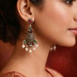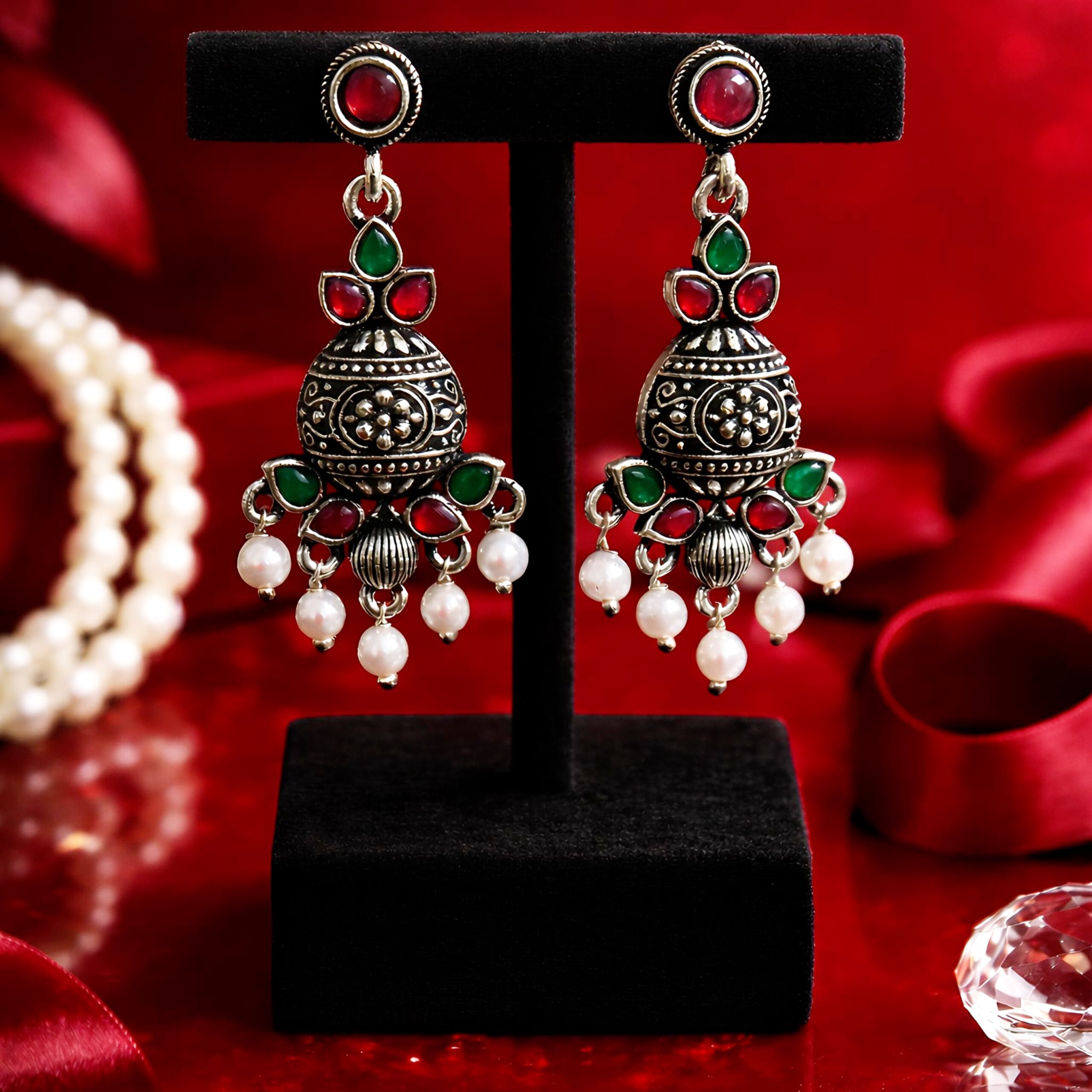 Beautiful oxidised silver earrings with red and green stone accents, detailed dome design, and soft pearl drops. A perfect mix of traditional charm and royal elegance for festive looks.