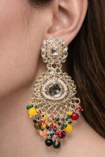 Beautiful kundan chandelier earrings adorned with sparkling stones and vibrant multicolor bead drops, adding a festive and elegant charm to any traditional outfit