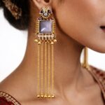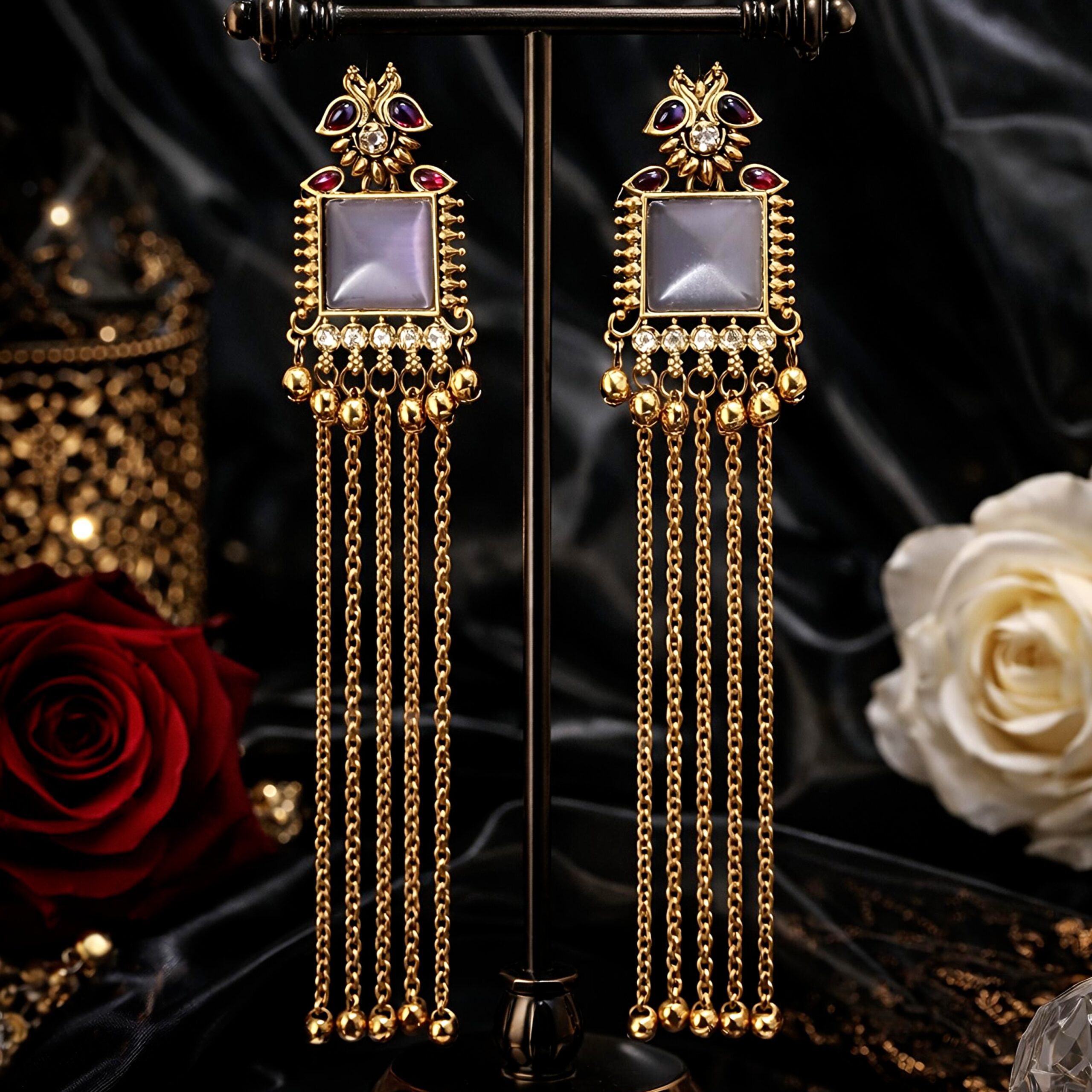 Elegant earrings with a soft stone centerpiece, ornate detailing, and long cascading gold chains , perfect for a refined and regal look.
