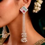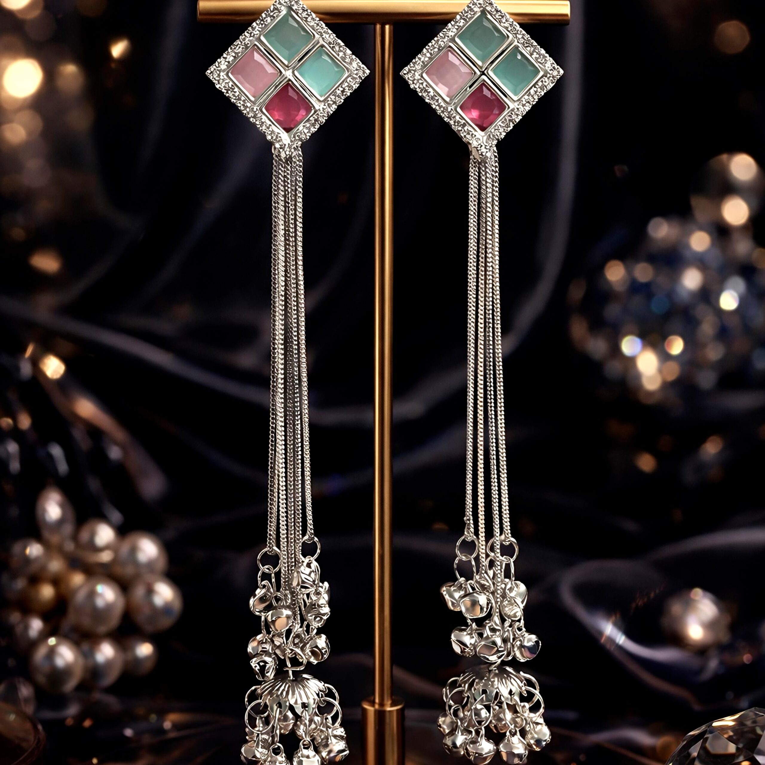 Elegant Kashmiri earrings featuring pastel stone-studded square tops, cascading silver chains, and delicate Jhumka -style charms, perfect for a graceful, festive look