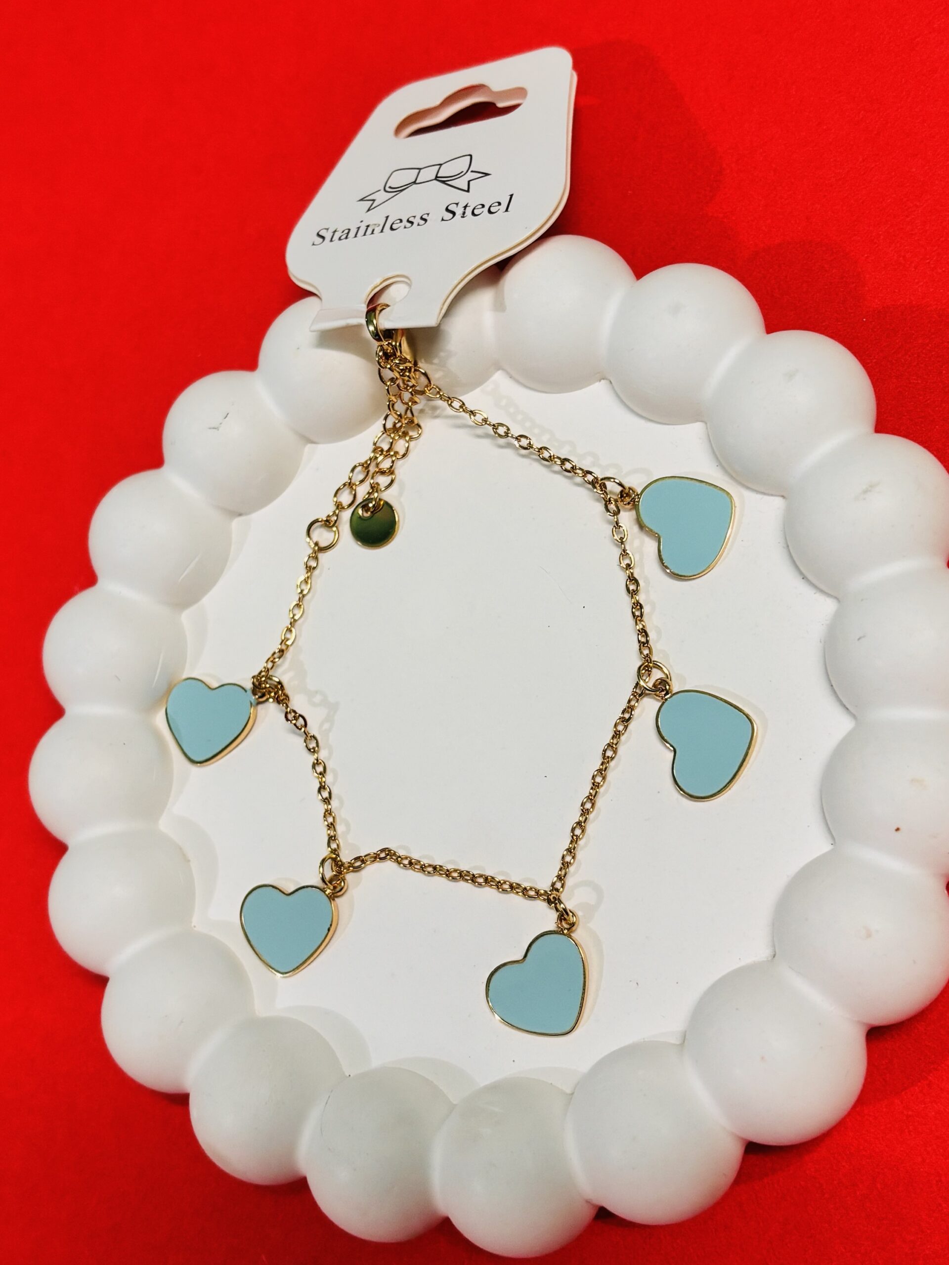 Add a pop of iconic color to your jewelry collection with this elegant heart charm bracelet. Crafted for durability and style, it features five beautifully spaced heart charms filled with a vibrant Tiffany Blue enamel, set against a radiant gold-toned finish.